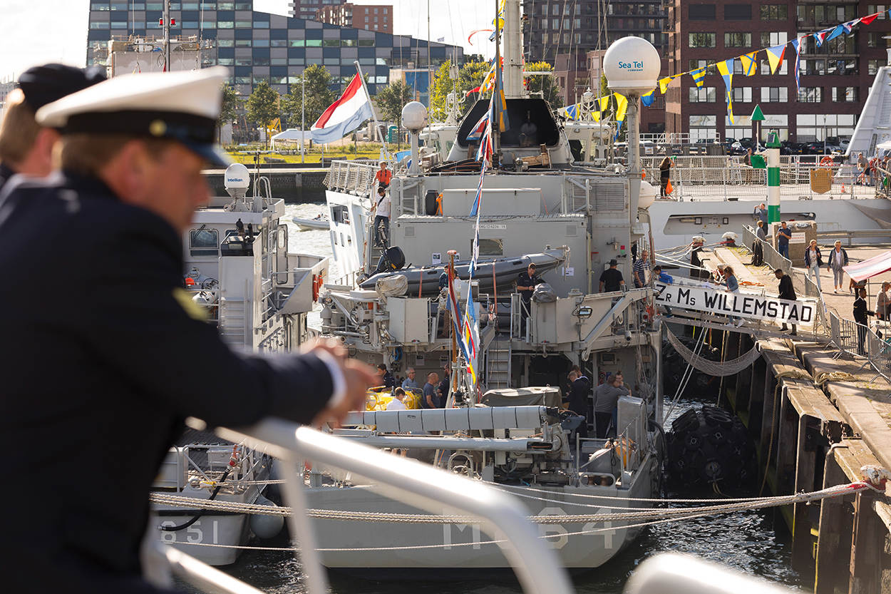 2 marinemannen kijken toe hoe het publiek zich opperbest vermaakt op onder meer Zr. Ms. Willemstad.
