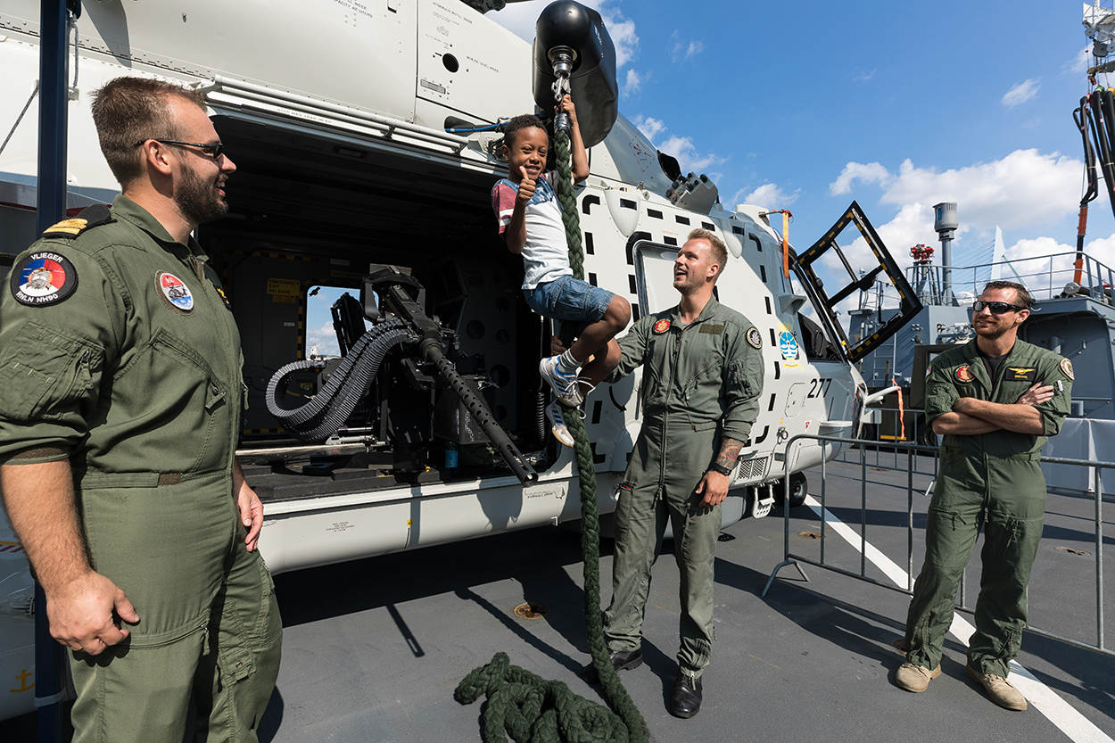 Een jochie is supertrots dat hij ‘aan’ de NH90 helikopter mag hangen. Het toestel staat op Zr.Ms. Karel Doorman, waar geïnteresseerden hem van dichtbij kunnen bewonderen. Alle schepen zijn opengesteld voor publiek.