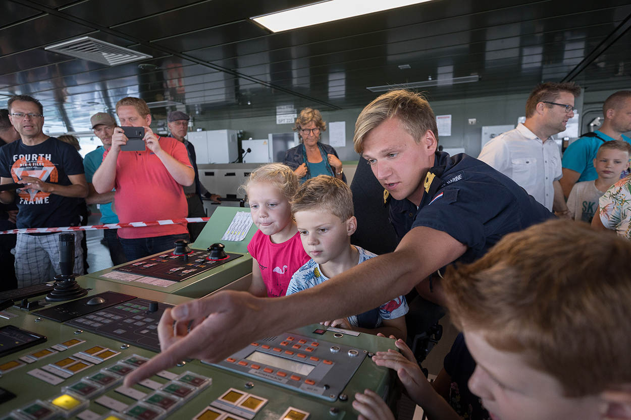 “Waar zijn al die knopjes voor”, vraagt een jongen belangstellend. Een marineman legt vervolgens zo eenvoudig mogelijk uit hoe het schip werkt en wat de commandant allemaal moet doen.