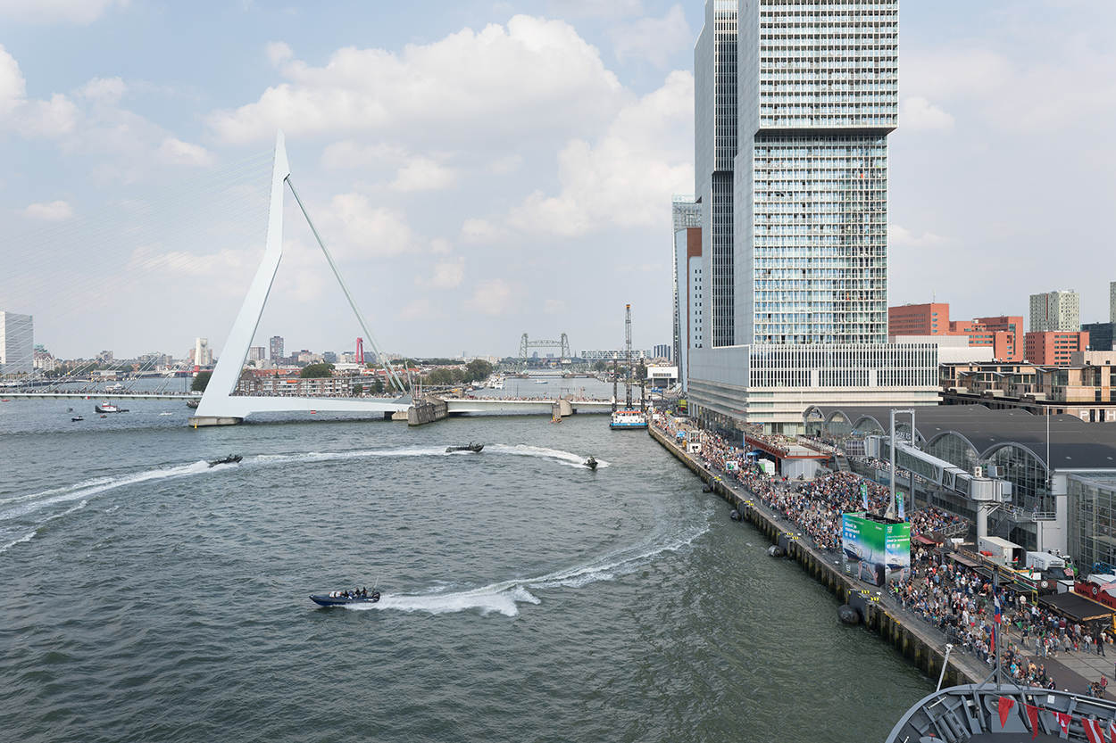 Een spectaculair uitzicht op de Nieuwe Maas en de Erasmusbrug, waar een demonstratie aan de gang is.