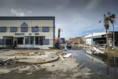 Het is de vraag die Binkie hardop stelt. Met zijn vrouw Ini woont hij al 30 jaar op het eiland. Hij stapt tussen de kapotgeslagen bloempotten, over de naar beneden gekomen pergola, richting zijn huis. Althans, wat daar van over is. Het dak is voor een deel verdwenen. Op de vloer staat een laag water en meubels zijn opgestapeld in een hoek gedrukt. “De enige droge plek”, zegt Binkie.