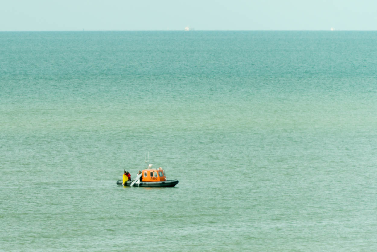 “Als ik geen contact krijg met dat zeiljacht, stuur ik ons bootje erop af. Helaas weet niet iedereeen dat we hier aan het oefenen zijn. Zolang de sector niet vrij is, mag de Bushmaster geen vuur uitbrengen”.