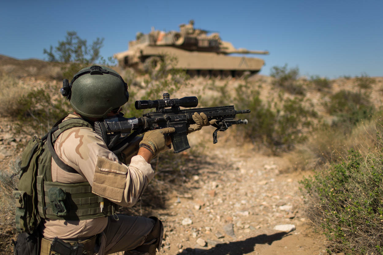 Mariniers zijn meer dan bekend met zanderige gebieden. De afgelopen decennia was de lichte infanterie (mariniers behoren tot de lichte infanterie, red.) bij herhaling actief in Afghanistan en Irak. Niet zo vreemd dat het rotsachtige, onherbergzame oefenterrein Twentynine Palms voor hen min of meer vertrouwd aanvoelt. Op het hier gevestigde Marine Corps Air Ground Combat Center beoefenen ze samen met Amerikaanse collega’s hoe ze tegenstanders onder druk moeten houden én uitschakelen.