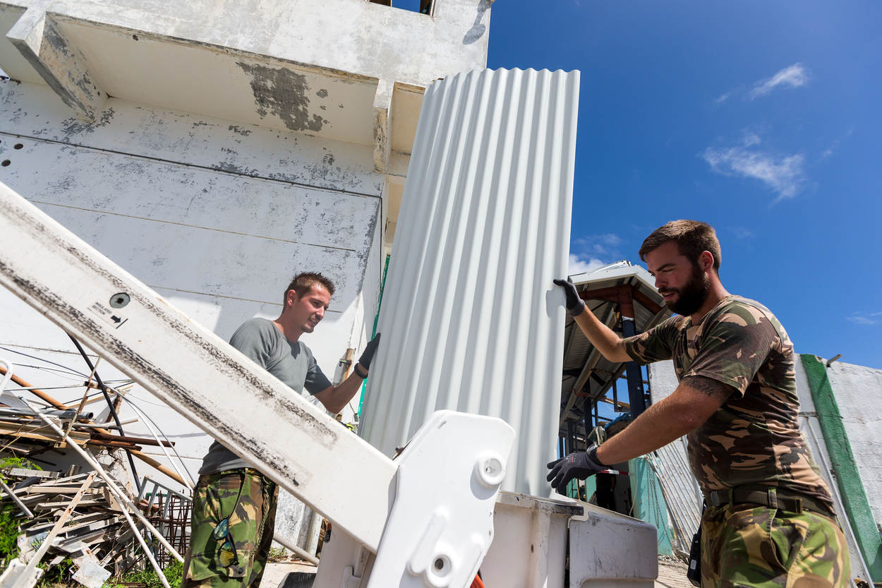 Een van de militairen die nog altijd hulp verleent op Sint Maarten is korporaal 1 Matthew van 101 CBRN verdedigingscompagnie, met als neventaak constructiewerk. Daaraan is geen gebrek. “Ik zit hier helemaal op mijn plek. We maken mensen blij. Helpen op Sint Maarten geeft energie. Dat is het leuke aan dit werk.”