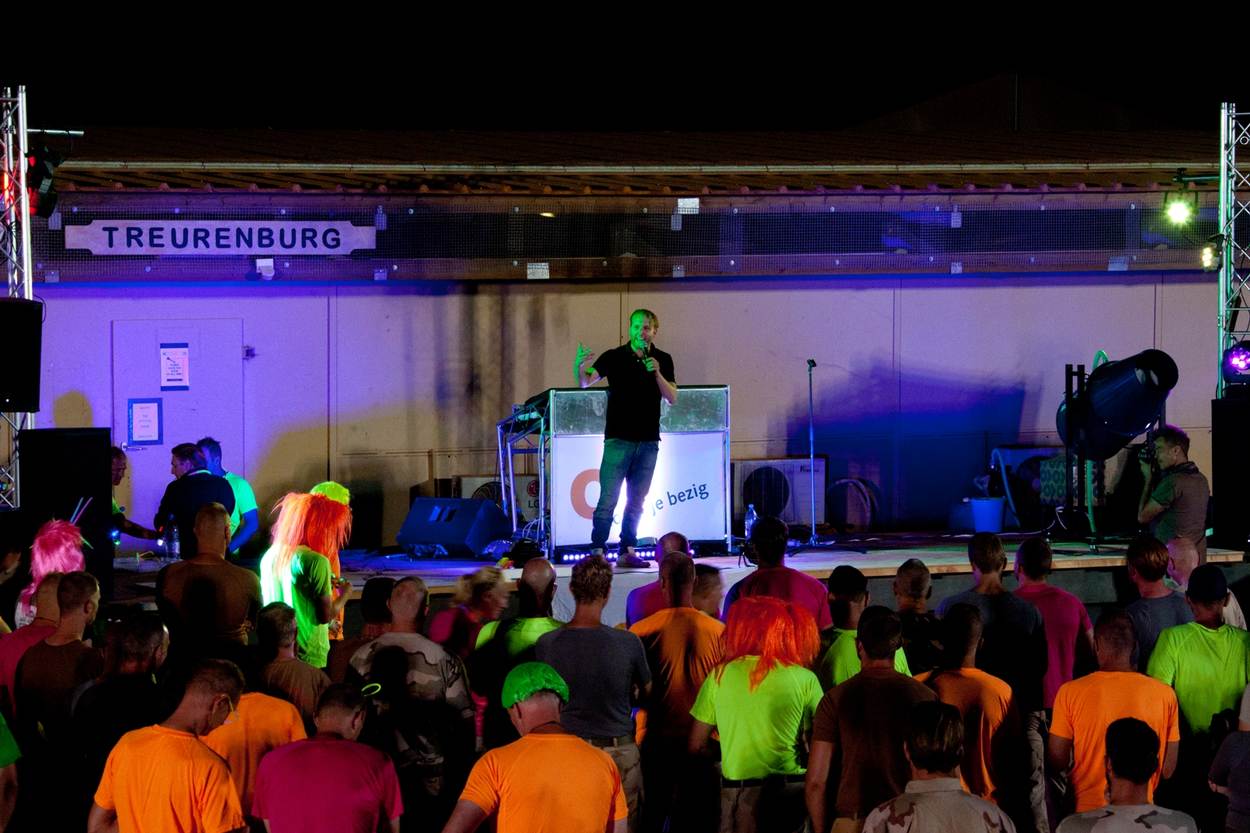 Het Kamp Castor basefeest, georganiseerd door bureau Ontwikkeling & Ontspanning van de Koninklijke Landmacht, was een fluorescerende schuimparty. Jouw stand-up was de aftrap, net na het avondeten. Een half uur grappig zijn voor een plein vol uitbuikende militairen; jij durft.