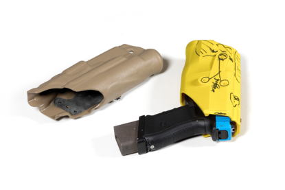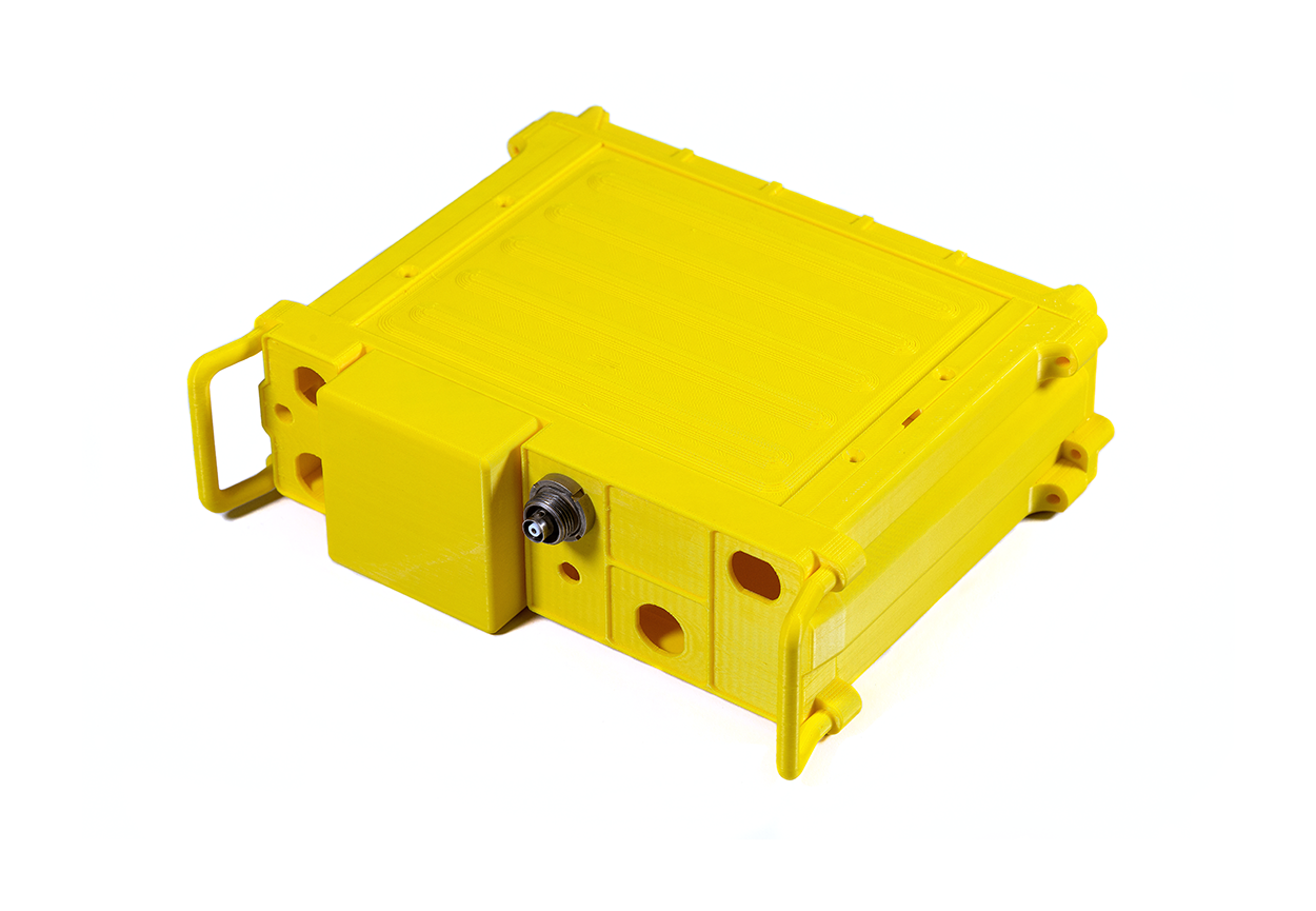 Hij pakt het gele ding voor hem op. “Dit is 1 van de 5 dummy’s die ik heb gemaakt. De afmetingen, aansluitingen voor connectoren, alles zit op dezelfde plek. Alleen dit exemplaar is hol. Deze gaat naar de fabrikant en Defensie kan later heel makkelijk de 3D-modellen vervangen door de echte.” Probleem opgelost.