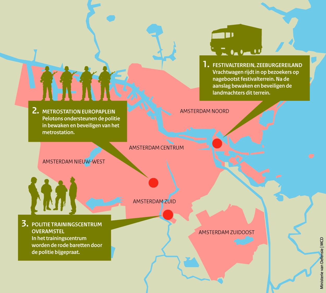 In het scenario richt het verzoek zich op het bewaken en beveiligen van twee locaties in Amsterdam: het door de aanslag getroffen festivalterrein en het metrostation, waarvan het vermoeden bestaat dat de ontkomen terroristen daar opnieuw zullen toeslaan. Intussen bespreken de pelotonscommandant van de rode baretten en de locatiecommandant van de politie de situatie. Dit ‘groen-blauwe’ kleurenpalet illustreert direct het unieke karakter van de terreuroefening. Alle hulpdiensten moeten met elkaar samenwerken om de nasleep van deze aanslag zo snel mogelijk te beëindigen en te zorgen dat de burgers veilig zijn.