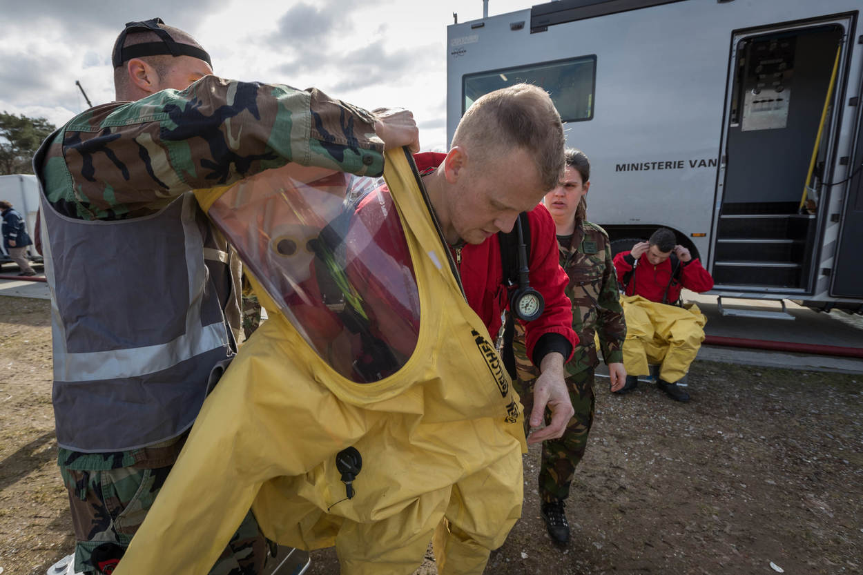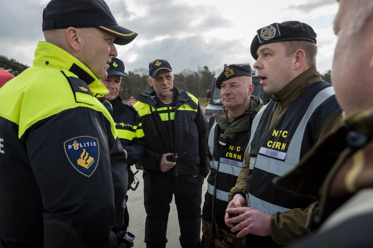 Dan komt de stroom verschillende uniformen op gang. Brandweer, GGD, ME, marechaussee, RIVM en de CBRN Respons Eenheid van Defensie. Het doel: samenwerken. Dat is best lastig met zoveel spelers. Iedereen wil hetzelfde, maar doet dat net op een andere manier. “Welk gebied rond de aanslag is veilig? Wie geeft het gebouw vrij? Daar moeten tussen de civiele partners en Defensie duidelijke afspraken over bestaan. Dat trainen we vandaag”, aldus Robert Raben van de Brandweer Flevoland.