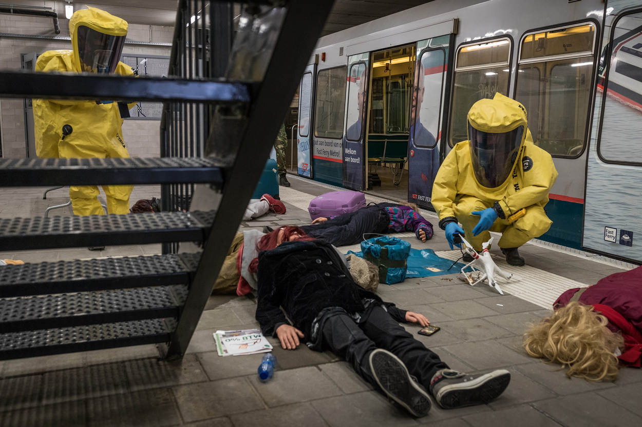 Terwijl de ME paniekerige slachtoffers tegenhoudt, gaan 2 verkenners van de Respons Eenheid met hun tools in een rolkoffertje het metrostation in. Defensie is hier ondergeschikt aan de brandweer. Die houdt de leiding. Daarom is het belangrijk dat de randvoorwaarden kloppen en de mannen in hun gaspak niet gehinderd worden. Hun zuurstofflessen hebben een beperkte inhoud, dus veel tijd is er niet.