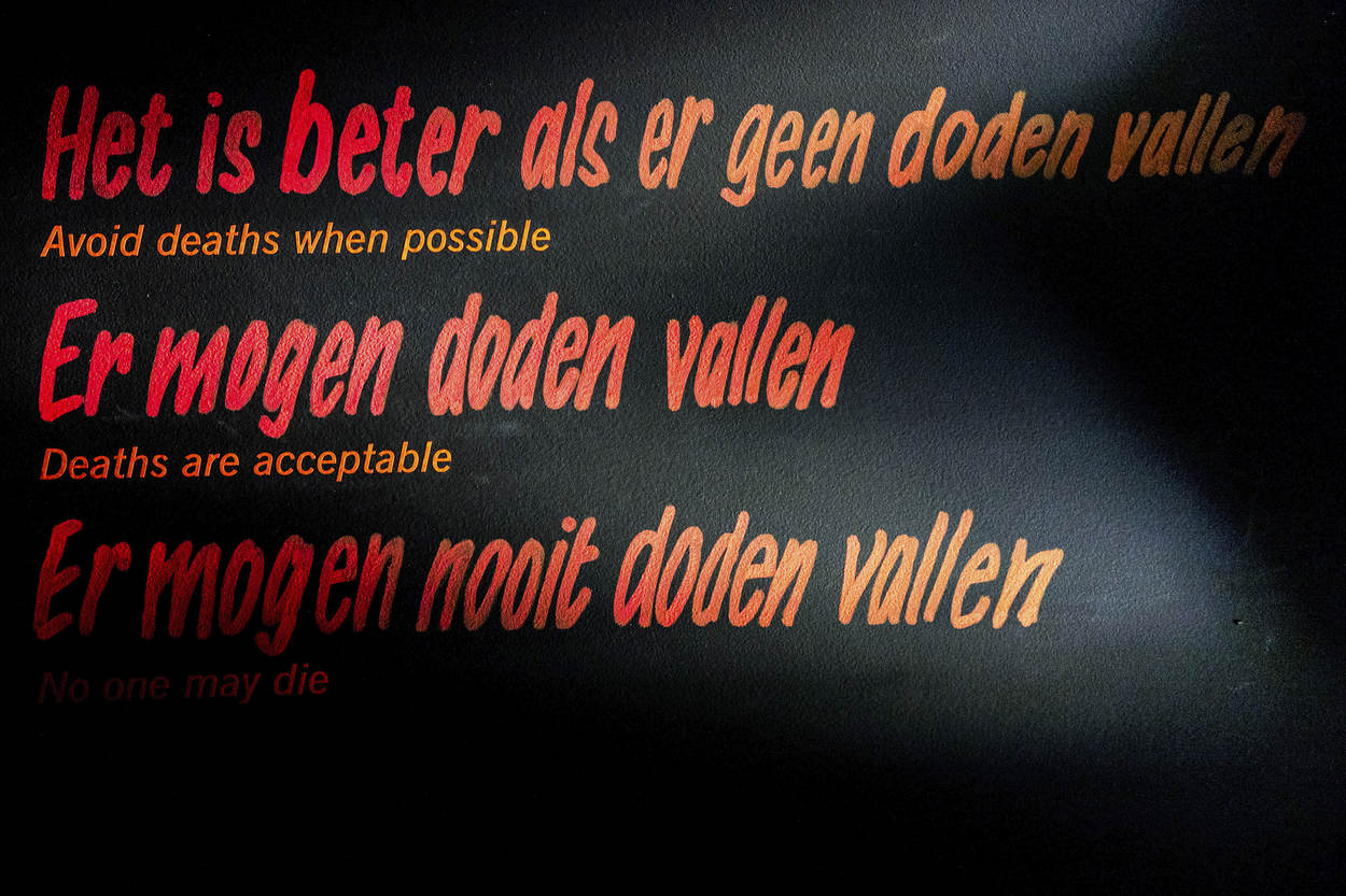 Om je daarbij te helpen liggen bij de entree van Explosiegevaar! koptelefoons klaar. Wanneer je ‘inlogt’ hoor je de stem van onder anderen acteur Eric Corton die de vele facetten van de aanslag belicht en de bezoeker vragen voorlegt.
