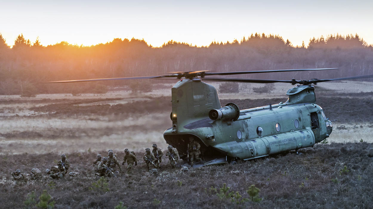 Een gezamenlijke actie tussen het Defensie Helikopter Commando en de Luchtmobiele Brigade op de Ginkelse Heide. Foto: Marco Ferrageau.