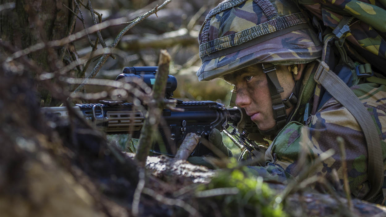 Tijdens de eindoefening van de Algemene Militaire Opleiding Luchtmobiel (AMOL) wordt het leggen van hinderlaag geoefend. Foto: Martin Bos.