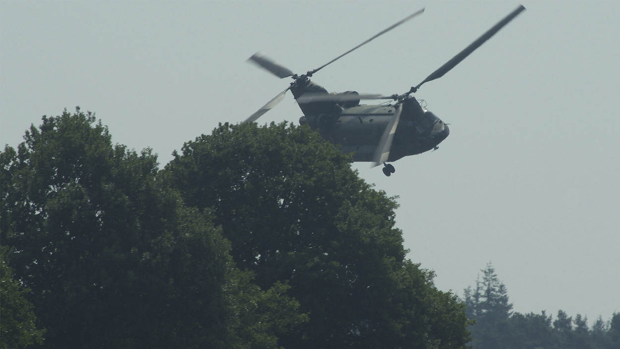 Met grote bomen op de achtergrond is mooi te zien hoe groot de Chinook wel niet is. Chris Sluijters maakte deze foto vorig jaar op de Ermelosche Heide.