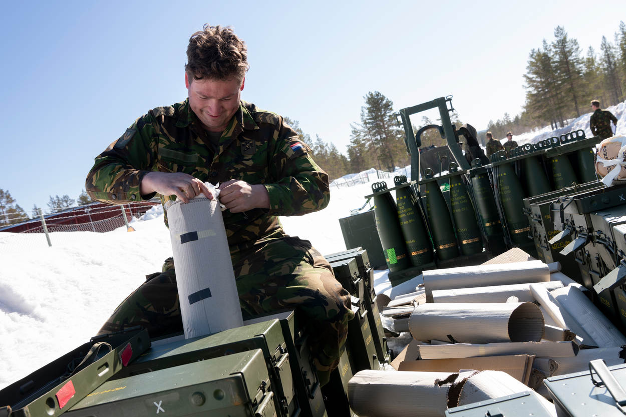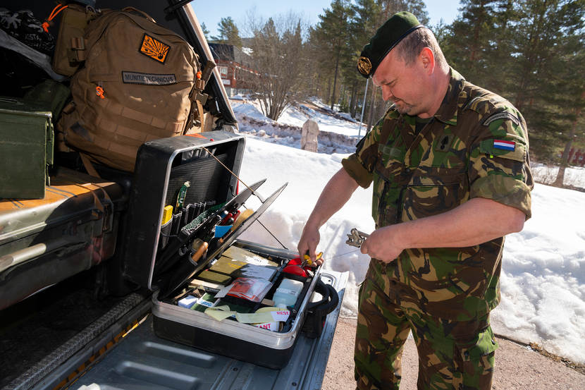Deze senior munitietechnicus staat borg voor de kwaliteit en veilig gebruik van munitie. “Elke oefening met scherpe munitie zijn wij bij aanwezig. We komen dan ook wereldwijd in actie, of het nu Zweden, Mali of de Antillen is. Met koffertje ja, daarin zitten de basisgereedschappen. Zoals dit tangetje dat we gebruiken bij het verzegelen. In dit werk is het altijd hollen, meestal geen tijd voor acclimatiseren. Zijn er incidenten met munitie, dan zorgen wij voor een veilige afvoer. Zo komen we tijdens deze artillerie-oefening bijna dagelijks in actie voor opengescheurde kardoes-zakken. Dat gebeurt dan meestal in het stuk, als er onder hoogspanning gewerkt wordt. Dan is een klein foutje snel gemaakt. De bemanning veegt in het stuk het kruit dan zelf op, wij zorgen voor de afvoer en een gecontroleerde verbranding. Defecte munitie laten we gecontroleerd springen, dat is het veiligste. Net als de eenheid zelf sta ik nu ook voor het eerst op dit oefenterrein in Zweden. Prachtig gebied, maar lastige omstandigheden met die sneeuw. De bemanning neemt die onder de laarzen mee naar binnen het stuk in, en kruit en vocht gaan niet samen. We krijgen nu een dooi-periode, dat betekent nog veel meer vochtigheid. Kardoezen die uit hun opslag het veld in zijn geweest, maar daar niet zijn verschoten, gaan we dus verbranden. Het is niet anders.”