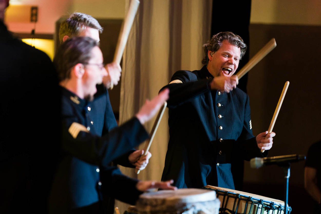 Slagwerker sergeant-majoor Menno Bats gaat helemaal op in de muziek tijdens een optreden van de Kapel Koninklijke Luchtmacht. Foto Paul Tolenaar.