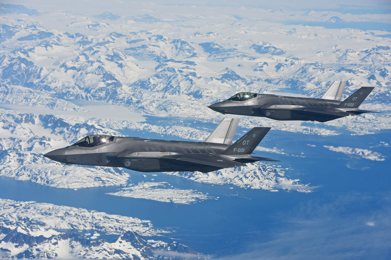 Eerste luitenant Jonker nam deze foto van F-35’s in 2016 boven Groenland vanuit de KDC-10.