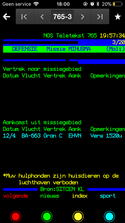 Op Teletekst (voor jonge lezers: een screenshot van NU.nl op een oude telexprinter) worden nog altijd de actuele vluchttijden van en naar missiegebieden gepubliceerd. Handig voor wegbrengers en ophalers, en gelukkig is er tegenwoordig een Teletekst-app.