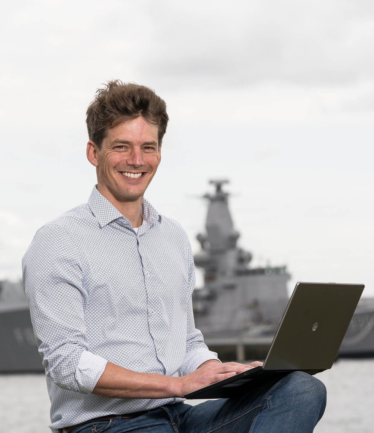 “Als klein jongetje wilde ik graag bij de marine. Lekker varen. Hoewel dat verlangen in de loop der jaren iets afnam, is het natuurlijk wel bijzonder dat ik uiteindelijk hier op de marinebasis in Den Helder ben beland. Toch nog bij Defensie. In mijn rol als engineer communicatie zorg ik er voor dat satellietcommunicatiesystemen werken, onderhouden worden en onderdelen op tijd zijn aangekocht. Gaat er hier iets mis, dan is er simpelweg geen communicatie meer mogelijk. Wanneer kennis, informatie en locaties niet meer gedeeld kunnen worden, mondt oorlogsvoering uit in een soort zeeslagje spelen. Mijn functie vervul ik grotendeels vanachter mijn bureau, maar ik kom alsnog met enige regelmaat aan boord van schepen om dingen te bekijken of uit te zoeken. Daarnaast bezoeken we vaak leveranciers in het buitenland. Zulke uitstapjes maken het werk natuurlijk extra leuk. Defensie heeft betaald voor mijn mbo-opleiding mechatronica en het uiteindelijk ook mogelijk gemaakt dat ik mijn hbo-diploma kon halen. Die vrijheid; iets kunnen doen als je dat wilt, is natuurlijk erg mooi. En eerlijk is eerlijk: de secundaire arbeidsvoorwaarden zijn ook niet verkeerd...”