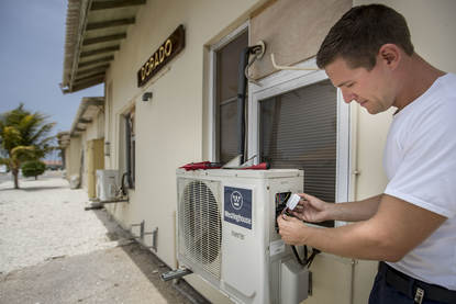 Hoofd Materieelsdienst LTZ 2OC (TD) Jeroen van Dasselaar (36) deed de laatste maanden onderzoek naar het energieverbruik op Savaneta. “Dag en nacht stond de airco aan en soms de ramen erbij open, verouderde verlichting en een paar zonnepanelen waarvan niemand wist of ze het überhaupt wel deden”, vertelt hij.