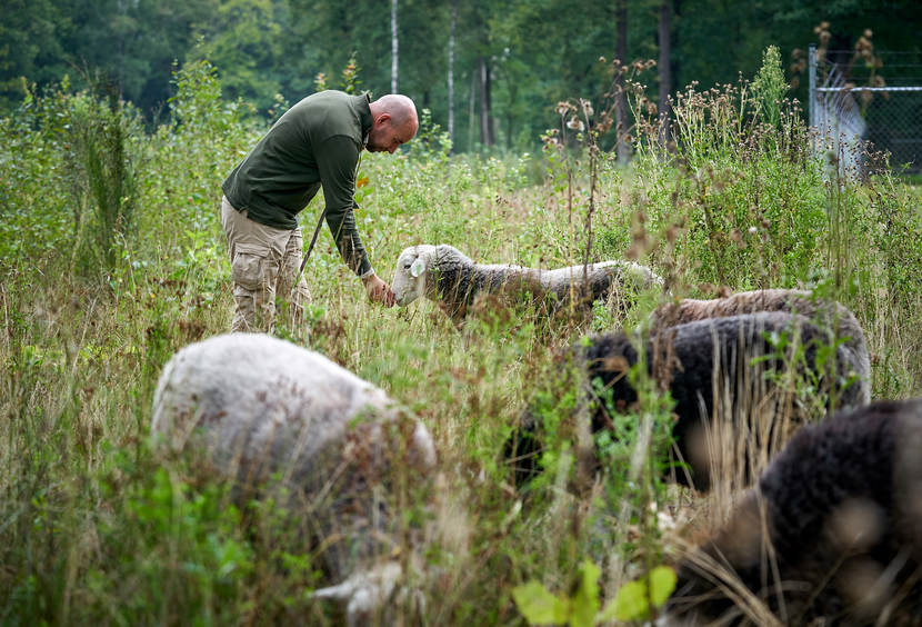 6 bijzondere Belgische Herdwick schapen, z’n bordercollies Buck, Lucy, Diesel en Katja én een stuk natuur op het oefenterrein van de Generaal-majoor de Ruyter van Steveninckkazerne in Oirschot. Meer heeft Andries Kaptijn niet nodig. “Sinds een paar maanden drijf ik hier schapen. Zij begrazen en onderhouden dagelijks een deel van het defensieterrein. Het zorgt voor ritme en houvast én het is goed voor de natuur. Je kunt er niet tegenop maaien.”