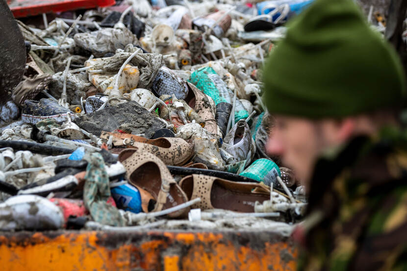 Het ruimen is puur handwerk. Het kleine grut zoals de zeeppompjes, wordt in vuilniszakken gemikt. De grotere spullen gaan regelrecht in de kiepwagen achter de tractor van een van de lokale boeren die stapvoets meerijdt.
