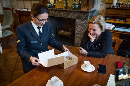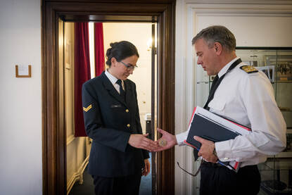Commandant der Strijdkrachten biedt Anna zijn coin aan