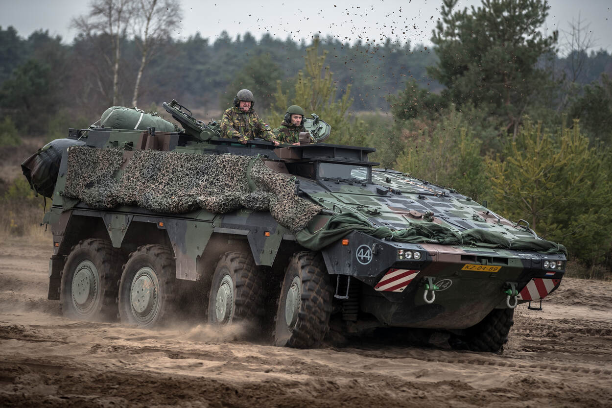 Met circa 50 kilometer per uur dendert Coumans met de Boxerbemanning door het stuifzandgebied. Af en toe steekt zijn hoofd uit het bovenluik. “Mooi dit. En wat blijft ie stabiel.”