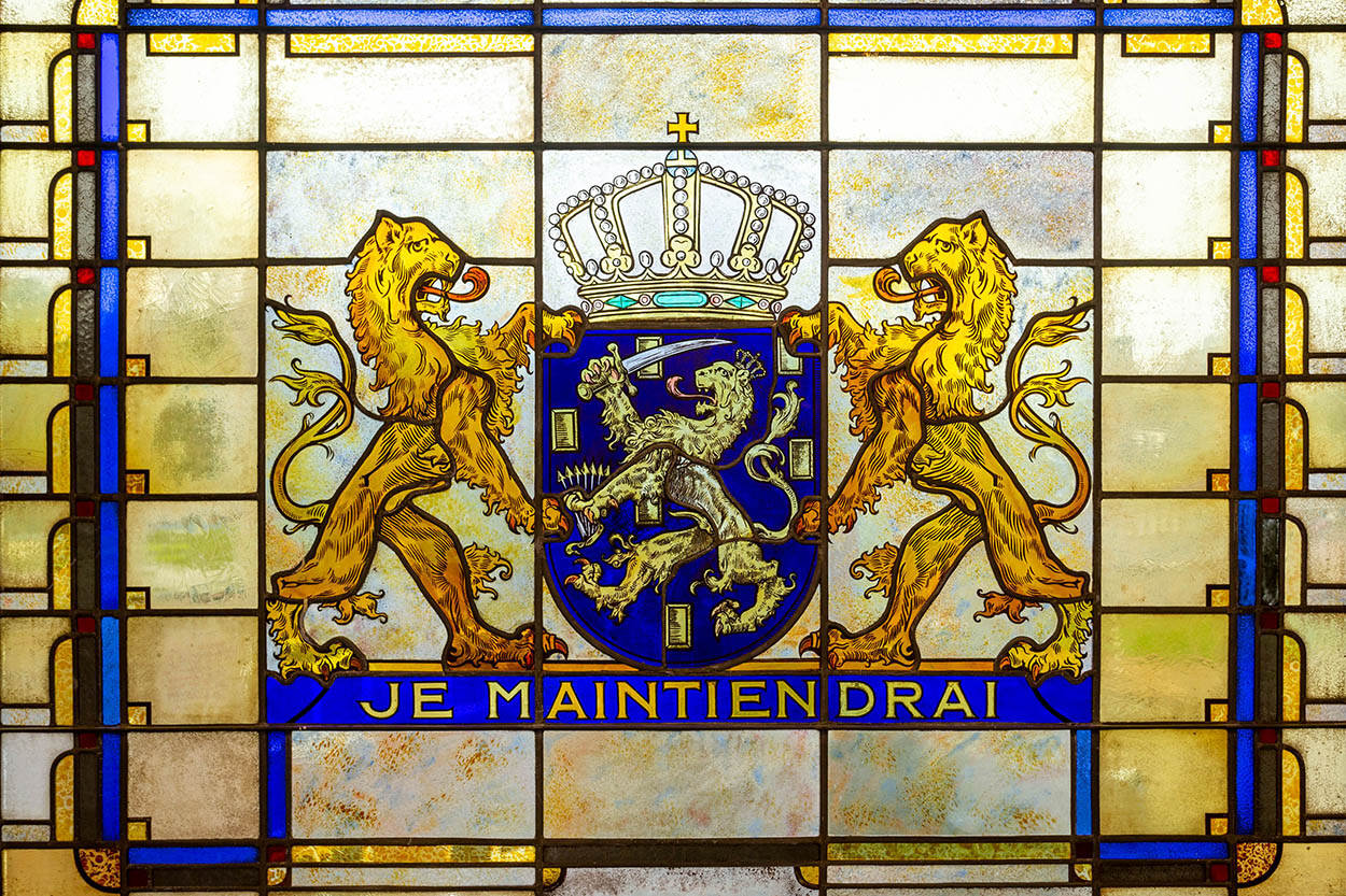 Dit glas-in-loodraam is te zien op de Generaal Spoorkazerne in Ermelo. De tekst betekent letterlijk ‘Ik zal handhaven’. Het is dé wapenspreuk van het huis van Oranje-Nassau, dat sinds 1815 wordt gebruikt. Foto: Jan van Schaffelaer.