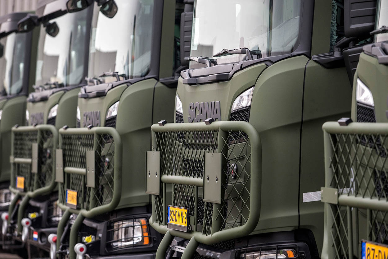 Een nieuwe lading Scania-trucks staat klaar om bij Defensie te beginnen. Foto: sergeant-majoor Gerben van Es.