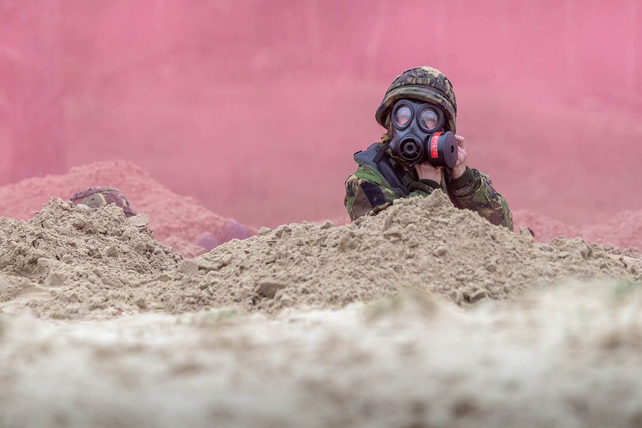 Tijdens de initiële opleiding van de marechaussee wordt ook met het gasmasker geoefend, zoals op deze foto te zien is. Foto: sergeant Sjoerd Hilckman.