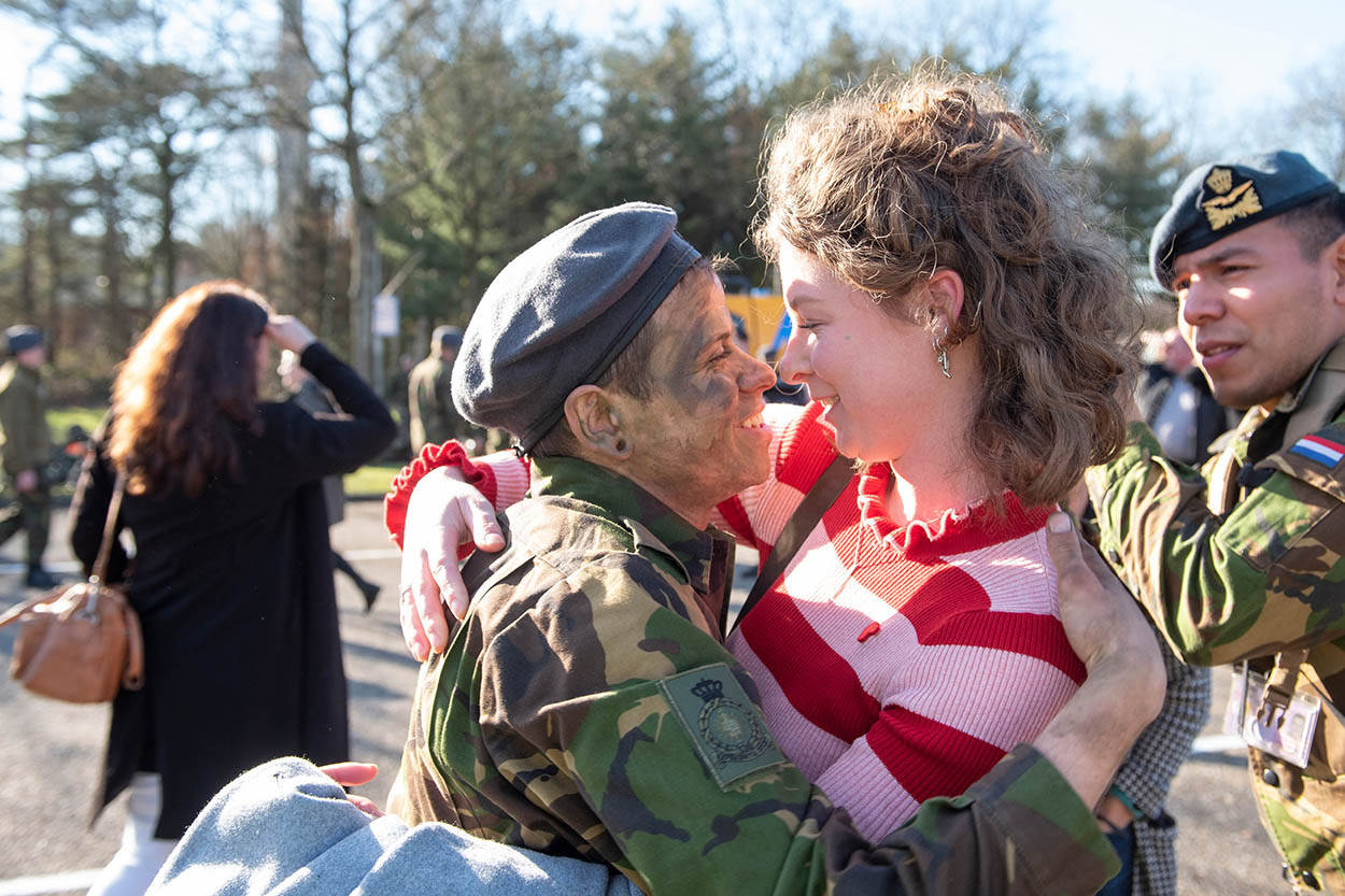 Dolgelukkige gezichten bij de baretuitreiking op de vliegbasis Woensdrecht. Na weken bikkelen zit de Algemene Militaire Opleiding bij de luchtmacht erop. Foto: Rene Verleg.