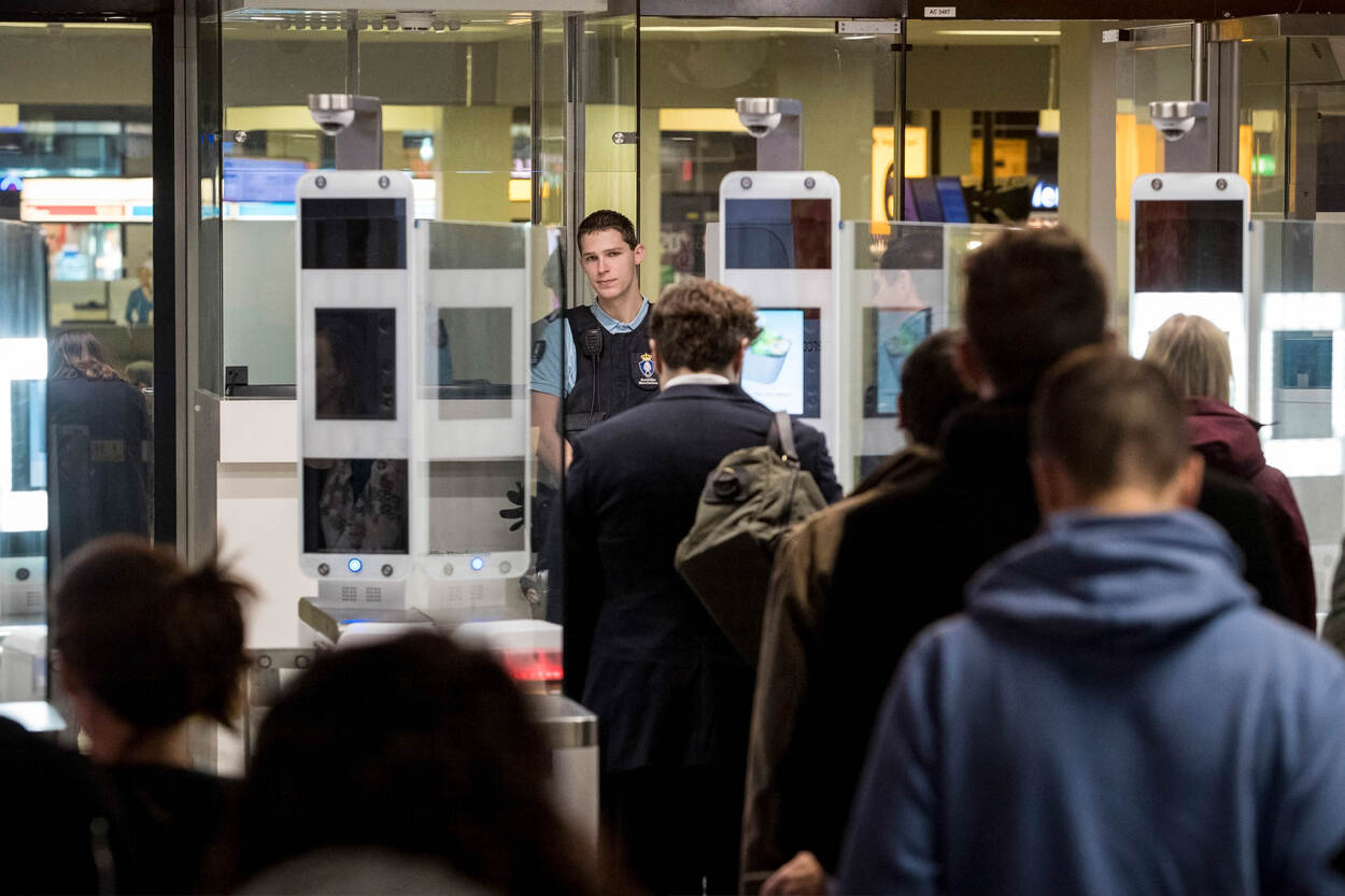 De Koninklijke Marechaussee houdt toezicht bij de selfservice paspoortcontrole op Schiphol. Zeker in de voorjaarsvakantie is het extra druk op de luchthaven. Foto: sergeant-majoor Gerben van Es.