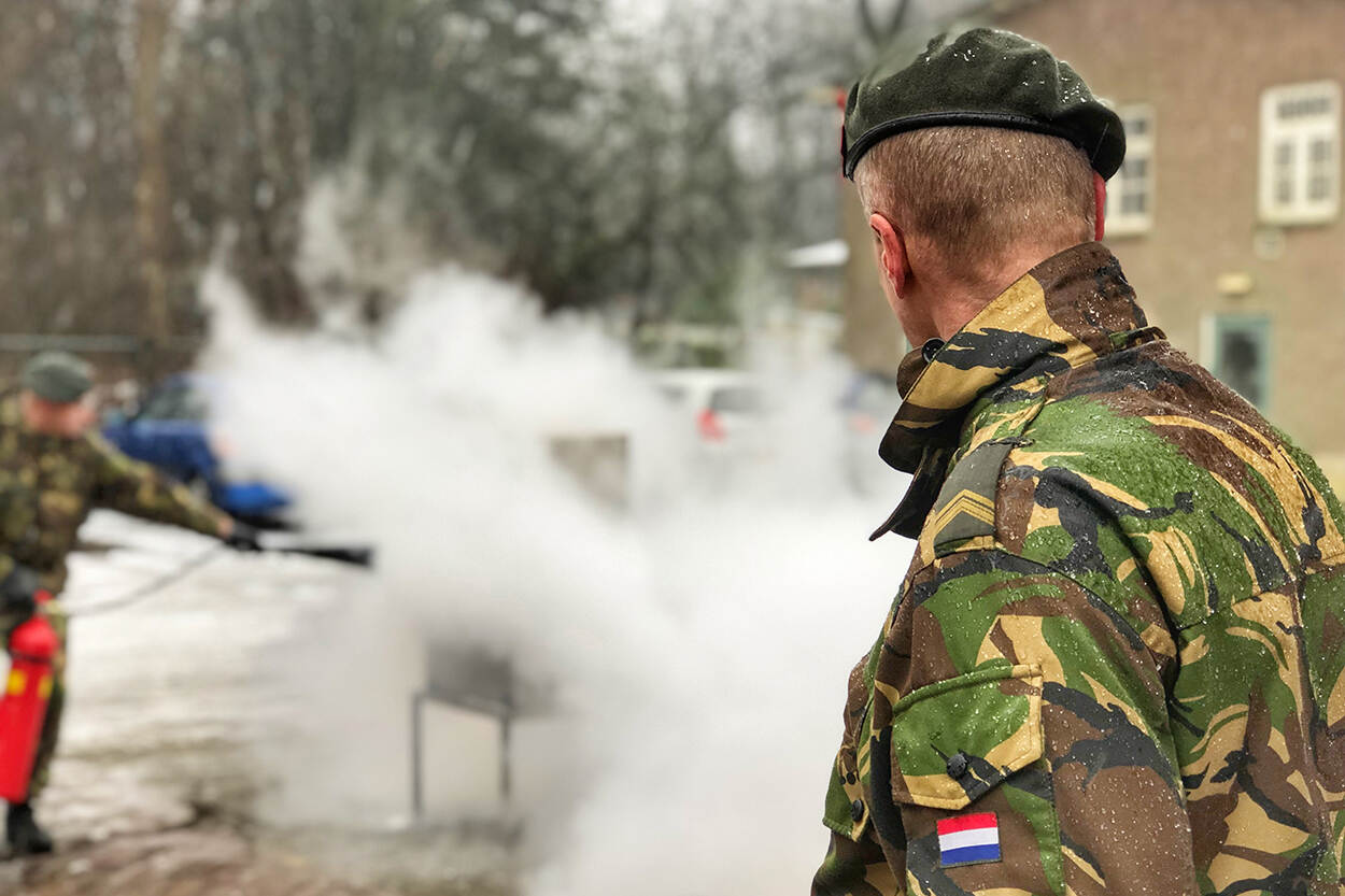 Reservisten van het Korps Nationale Reserve trainen hun militaire basisvaardigheden. Zoals schieten, het gasmasker gebruiken en oefeningen met de brandblusser zoals op deze foto. Foto: Manfred Oostveen.