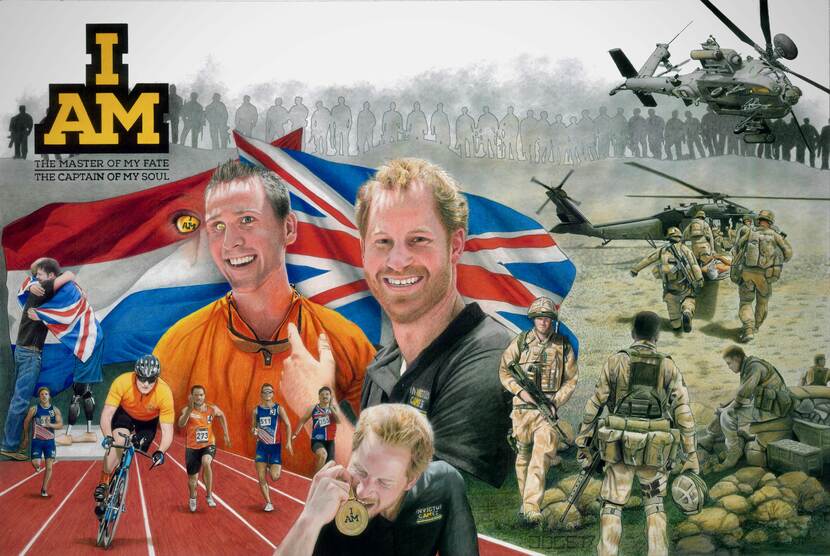 “99% van zijn creaties heeft een link met Defensie.” De werken hangen in het Nationaal Militair Museum in Soesterberg, de Kromhoutkazerne en… "Kensington Palace”, lacht Gelissen. “Het team van de Invictus Games zocht een geschenk voor prins Harry. De Britse prins kreeg het cadeau oktober vorig jaar aangeboden. “Een eer. Hij heeft een echte JoGe hangen.”