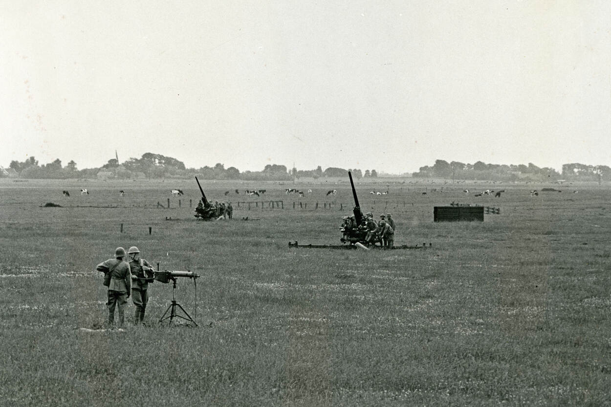 Bewoners rond het militaire vliegveld Ypenburg bij Den Haag denken in de nacht van 10 mei 1940 onweer te horen. Al snel wordt duidelijk dat het om vliegtuiggebrom en bommen gaat. Bij het Park Leeuwenbergh, ten noorden van het vliegveld, verschijnen rond 3.30 uur ‘vliegtuigen van Duitsche nationaliteit’ boven de 13e Batterij Luchtdoelartillerie. Reserve eerste luitenant Du Mee laat zijn mannen de vijand meteen onder vuur nemen. Brandend storten een aantal vliegtuigen neer maar een deel laat zijn bommen op positie vallen. Dienstplichtig korporaal-ziekenverzorger Jan van Oudheusden wekt ondertussen de ploeg die om 8 uur de batterij zou overnemen, deelt aan ieder 5 patronen uit en snelt naar de batterij.