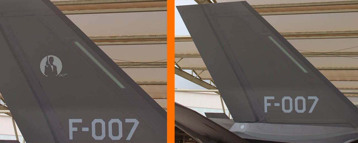 Het aantal Nederlandse F-35’s op Luke Air Force Base neemt gestaag toe. Inmiddels is ook de F-007 gearriveerd op zijn nieuwe thuisbasis. En bij 007 denkt iedereen natuurlijk gelijk aan de Britse filmheld James Bond. Niet zo vreemd dat het toestel snel voorzien was van een mooi embleem op de staart.