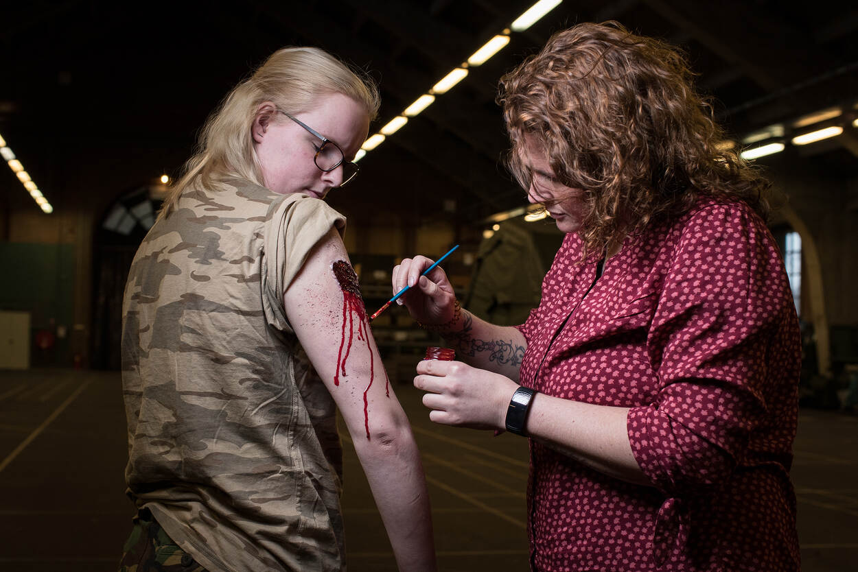 “Zet dat bloed even in de magnetron.” “Met gele haargel kun je een blaar maken.” “Die wond is mooi zeg, doe er nog wel wat ‘dirtspray’ op”. Voor wie de context mist, zijn het ietwat dubieuze uitspraken, maar LOTUS-slachtoffers kijken er niet van op. Als wondenmaker en trainingsacteur zorgen ze voor levensechte oefenscenario’s.