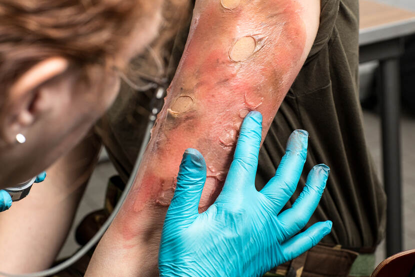 Met grimeren had hij in het begin wat moeite, maar oefening baart kunst. “Je kunt dit werk ook doen tijdens een EHBO-cursus in een buurthuis, maar dan gaat het vooral om huis-tuin-en-keukenverwondingen. Bij Defensie draait het om traumazorg. Heel fascinerend.”