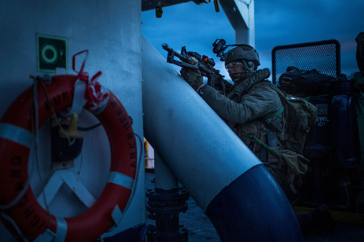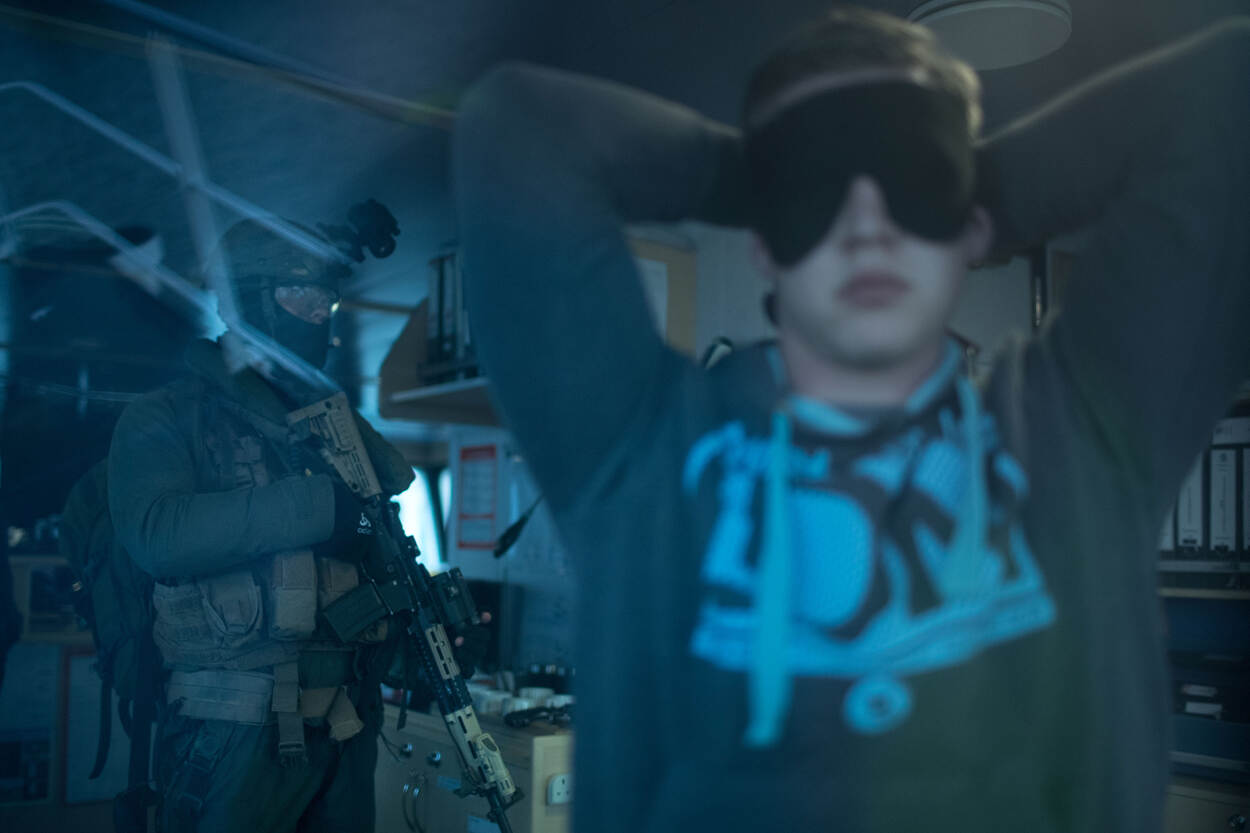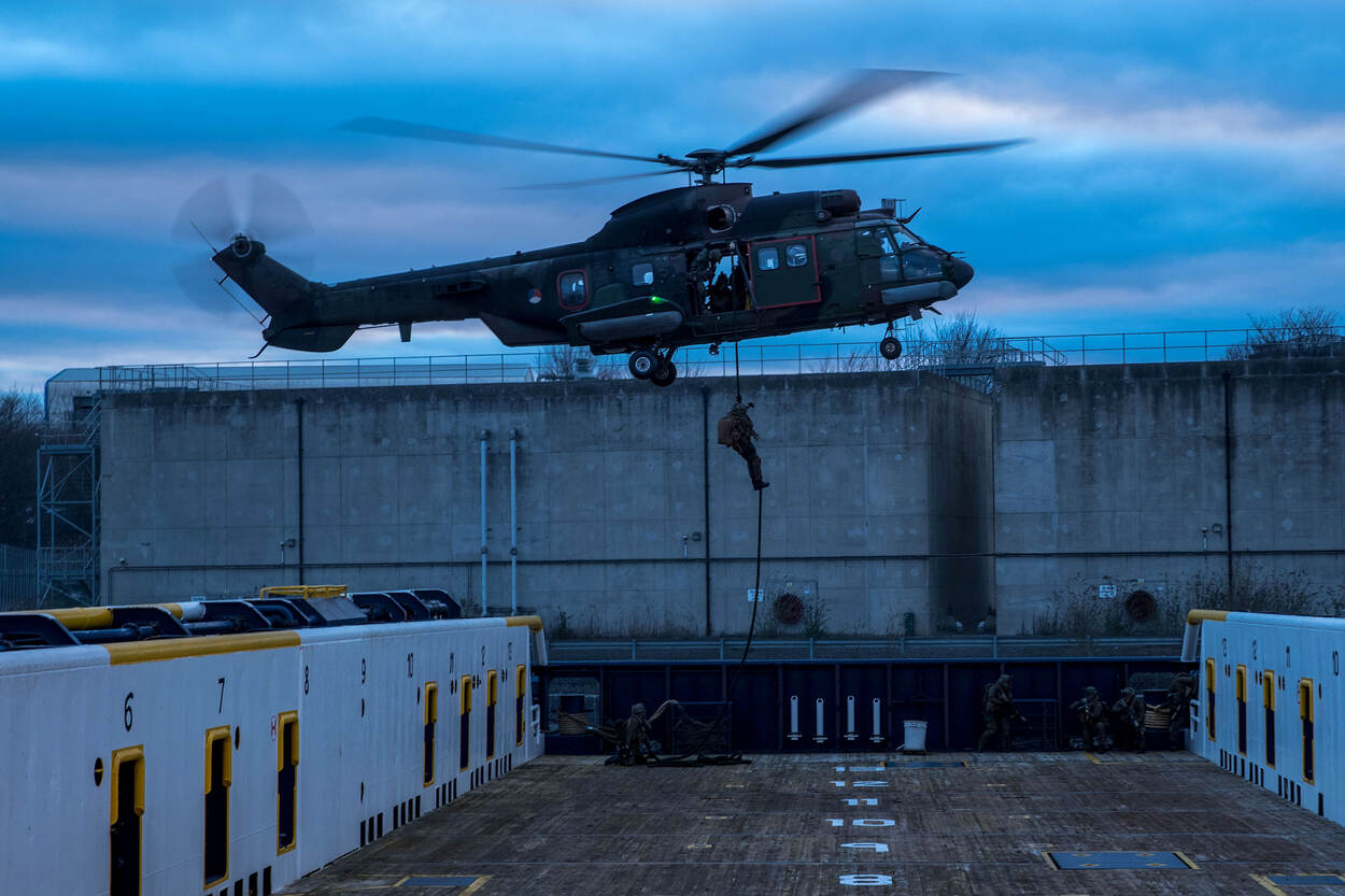 “Hands on the ground! Move! MOVE!” Met de wapens in de aanslag bestormen de mariniers van het 21 Raiding Squadron van het Korps Mariniers een vijandelijk schip in de haven van het Britse Sunderland. Met een landingsvaartuig en Cougar. Al fastropendlanden tientallen militairen op het schip. Klaar voor actie.