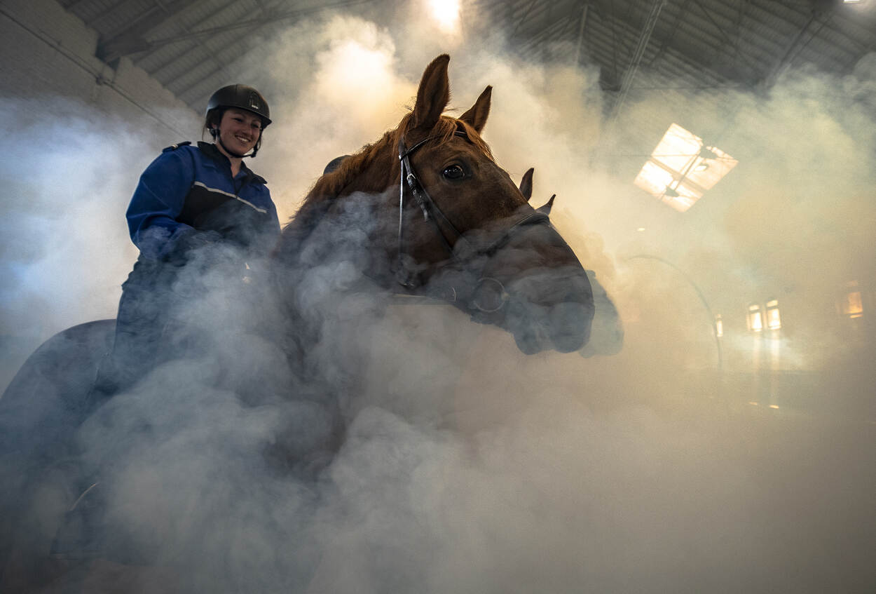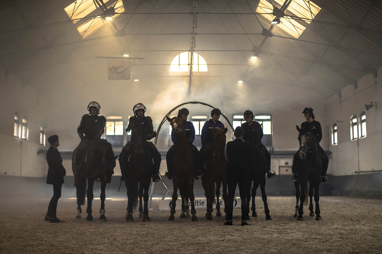 Zonder aarzelen springen de nog jonge paarden door brandende hoepels. Muziek, rook en een berg lege flesjes water… niets leidt ze af. Terwijl ze een paar maanden geleden nauwelijks ‘zadelmak’ waren, blijven ze nu koelbloedig staan als voor hun neus een gasballon kapot knalt.