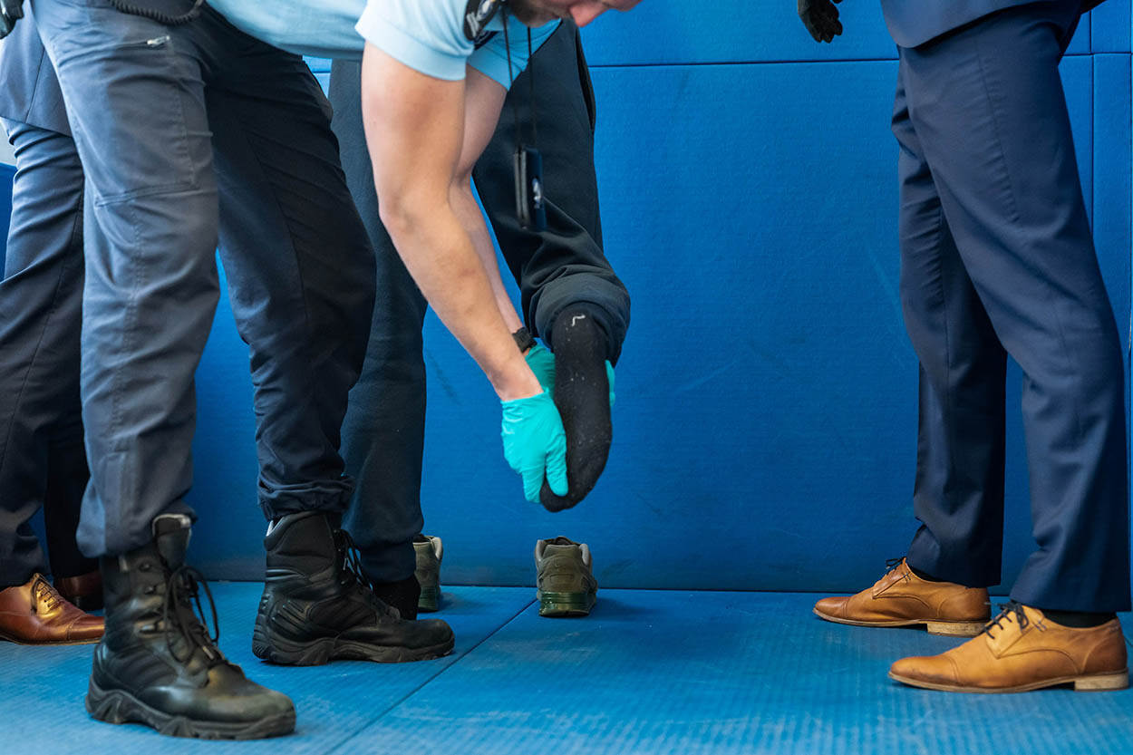 Bij verdachte situaties op Schiphol komt de Koninklijke Marechaussee in actie, zoals op deze foto te zien is. Foto: Louis Meulstee.