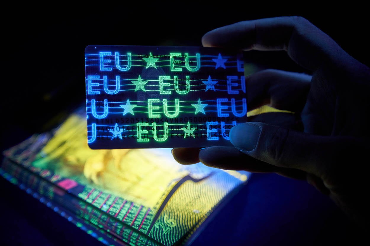 Het Expertisecentrum Identiteitsfraude en Documenten van de Koninklijke Marechaussee controleert onder meer paspoorten en identiteitsbewijzen op echtheid. Dat kan bijvoorbeeld met uv-licht. Foto: Phil Nijhuis.