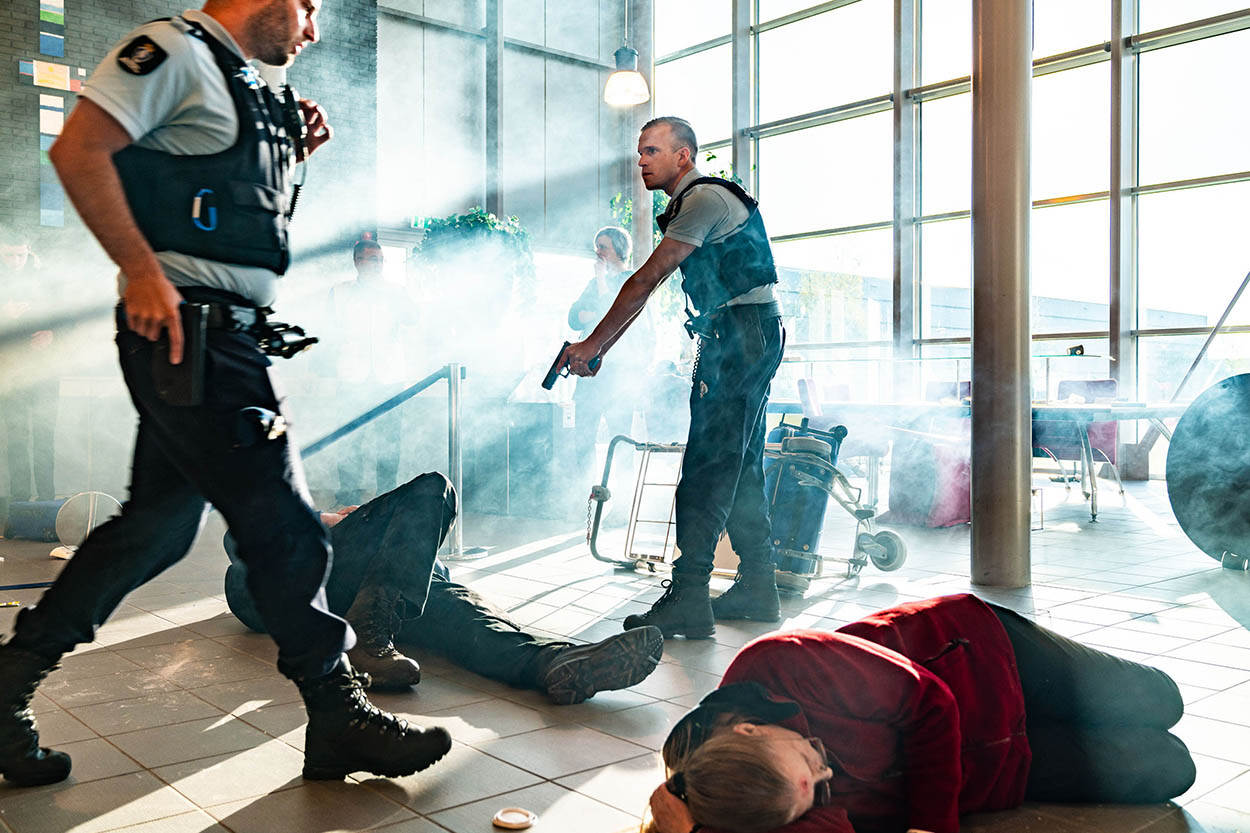Rondom vliegbasis Eindhoven is eind vorige maand een grote rampenoefening gehouden. Er werd een schietpartij met terroristisch motief nagespeeld. Foto: Louis Meulstee.