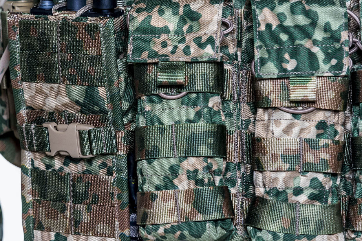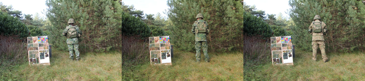 Wat is eigenlijk het effect van niet gecamoufleerde bandjes en klittenband? Deze interessante onderzoeksvraag popte op tijdens de zoektocht naar uitrustingscamo. Zoals eerder gezegd: camoufleren is topsport en alles moet goed zijn. Effen gekleurde delen blijken meer invloed te hebben op de camouflagewerking dan verwacht. Zeker als er meerdere banden dicht bij elkaar zitten, zoals op een vest. Ze worden dan als 1 groot, effen vlak gezien. Zelfs als er tussen de bandjes wel camouflage zit. Daarom moeten ook kleine elementen gecamoufleerd zijn.