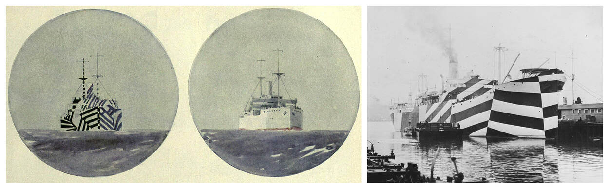 Camouflage is van alle tijden. De Britten legden tijdens de Eerste Wereldoorlog de basis voor een meer structurele en wetenschappelijke benadering. De Royal Navy ontwikkelde de zogenoemde razzle-dazzle-camouflage voor marineschepen. Dit waren complexe patronen van elkaar kruisende en onderbrekende geometrische vormen in contrasterende kleuren. Het doel was niet verbergen, maar onduidelijkheid scheppen over richting, afstand, snelheid en aantal. Het verloor nut door de opkomst van de radar.