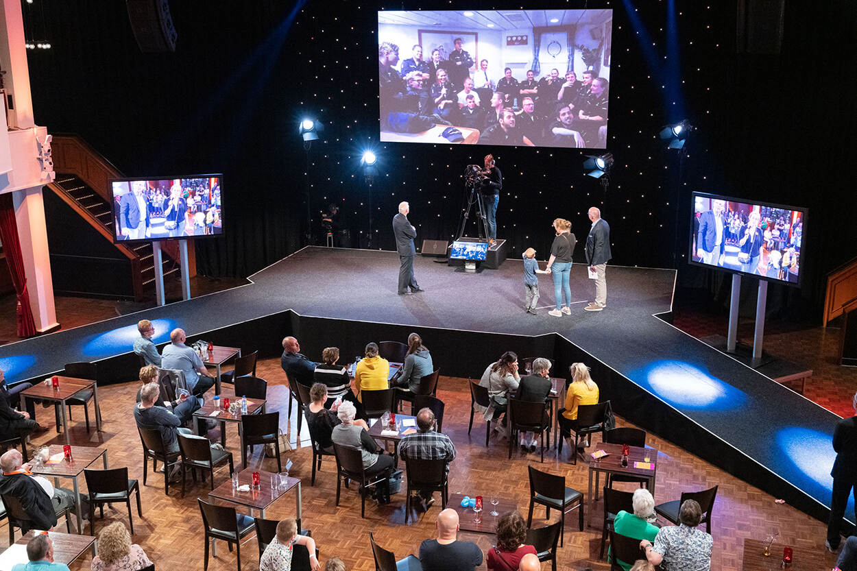 Op een scherm van zo’n 4 bij 4 meter kunnen militairen even een woordje wisselen met hun geliefde, vriend of familielid. En hoewel het tegenwoordig makkelijk is om contact met hen te hebben via de telefoon, Whatsapp of Skype, is dit nog altijd een gouden formule tijdens de Thuisfrontdag in Nijkerk. Foto: Louis Meulstee.