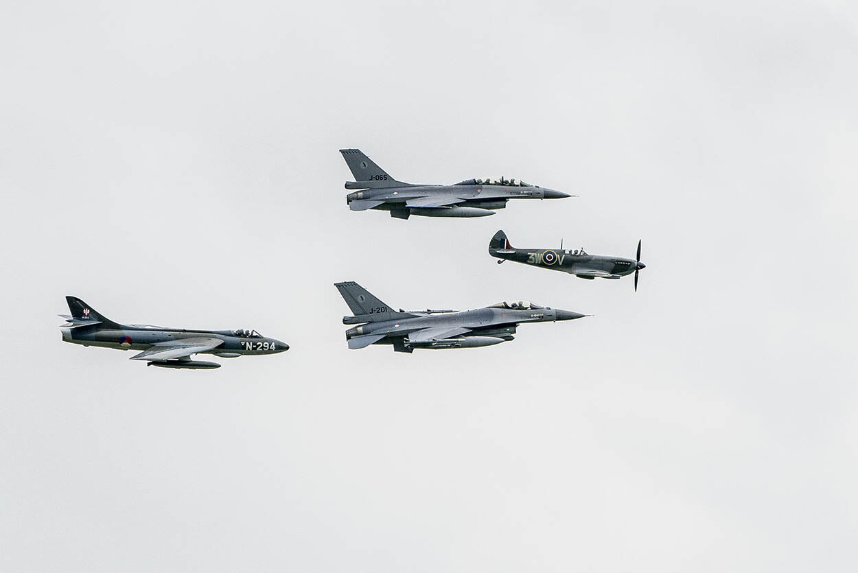 Precies 40 jaar nadat de eerste F-16 landde op vliegbasis Leeuwarden, maken de toestellen samen met een Hawker Hunter en een Spitfire een flyby. De Spitfire, eigendom van Jumbo-topman Frits van Eerd, heeft het prestigieuze embleem van 'Polly Grey' op haar romp gekregen. Kenners weten dat dit embleem toebehoort aan het 322 Squadron, het oudste squadron van de Koninklijke Luchtmacht. Het squadron vloog tijdens de Tweede Wereldoorlog met Spitfires en was gespecialiseerd in het neerhalen van Duitse V-1 vliegende bommen.