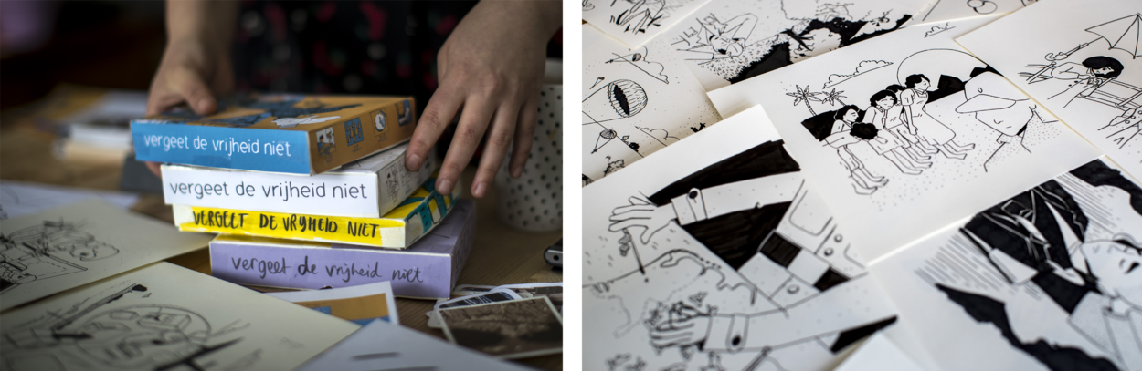 In de woonkamer van Renée ligt de eettafel bezaaid met tientallen tekeningen in stift en potlood. “Hier werk ik vaak, voor ik achter de computer in mijn werkkamer kruip.” Uiteindelijk haalden 45 prenten daadwerkelijk het spel. “45, vanwege het jaar van de bevrijding: 1945. Van school wist ik het 1 en ander over de oorlog en de bevrijding, maar van ‘moffenmeiden’ had ik bijvoorbeeld nog nooit gehoord.”
