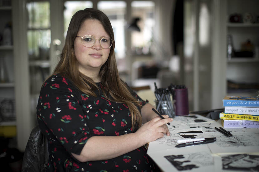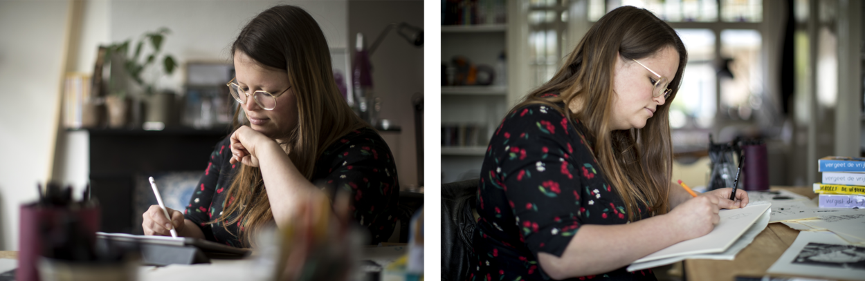 Al tijdens haar studie op de kunstacademie in Breda werd Renée van den Kerkhof freelance illustrator. Zo zit ze nu de ene dag in de rechtbank om tekeningen van verdachten te maken, en de volgende bij een groot evenement voor live-illustraties. “Mijn opdrachtgevers zijn dagbladen, vakbonden, stichtingen, mensenrechtenorganisaties en gemeenten. Mijn werk lijkt vaak helemaal niet op elkaar: ik heb niet 1 stijl. De enige overeenkomst tussen mijn werk is dat alles raakvlak heeft met een maatschappelijk thema.” De illustrator maakte vorig jaar een kaartspel met het thema ‘vrouwen in de politiek’, vanwege 100 jaar vrouwenstemrecht.