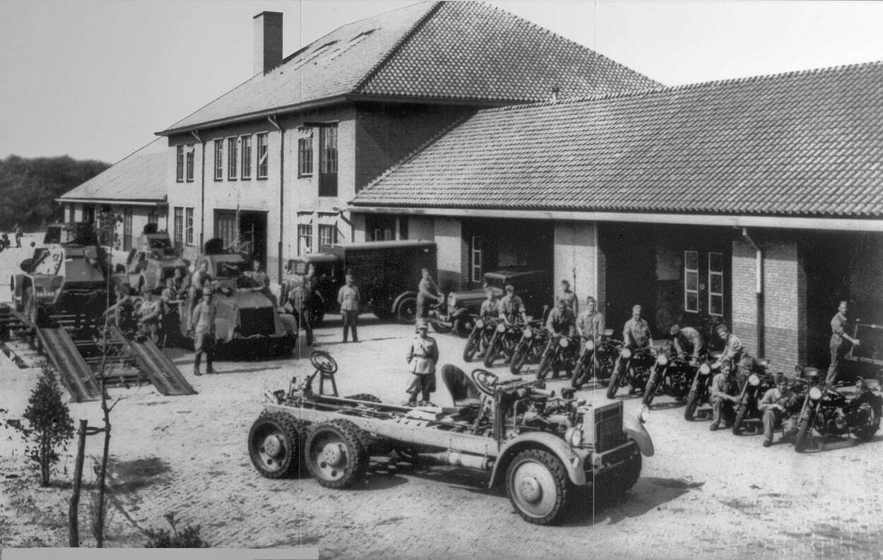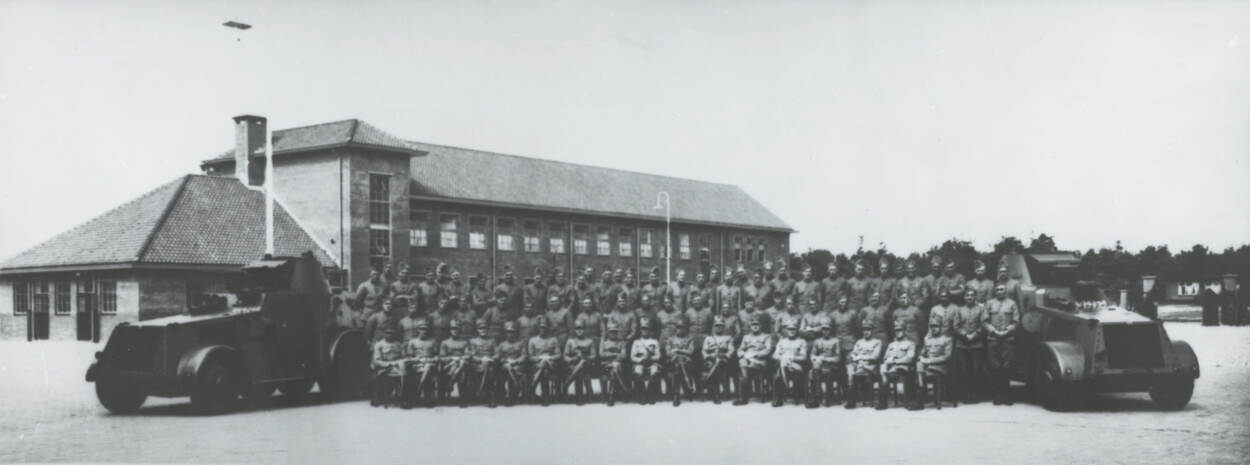 In de jaren 30 ziet de Nederlandse legerstaf in dat een grondige vernieuwingsslag nodig is om op het internationale strijdtoneel mee te komen. Tanks en pantserwagens zijn onderdeel van dat plan. De politiek komt echter pas laat met geld over de brug. In 1936 wordt het 1e Eskadron Pantserwagens opgericht dat in Vught op de Frederik Hendrikkazerne terecht komt. 2 jaar later volgt het 2e Eskadron met 12 pantserwagens M.38. Speciaal voor dit nieuwe cavalerieonderdeel verrijst bij het oefenterrein de Vlasakkers in Amersfoort een moderne kazerne bestaande uit een groot garagegebouw en gebouwen voor legering en wachtcommandant. Het complex wordt vernoemd naar prins Bernhard, zelf ritmeester en veel in Amersfoort te vinden.